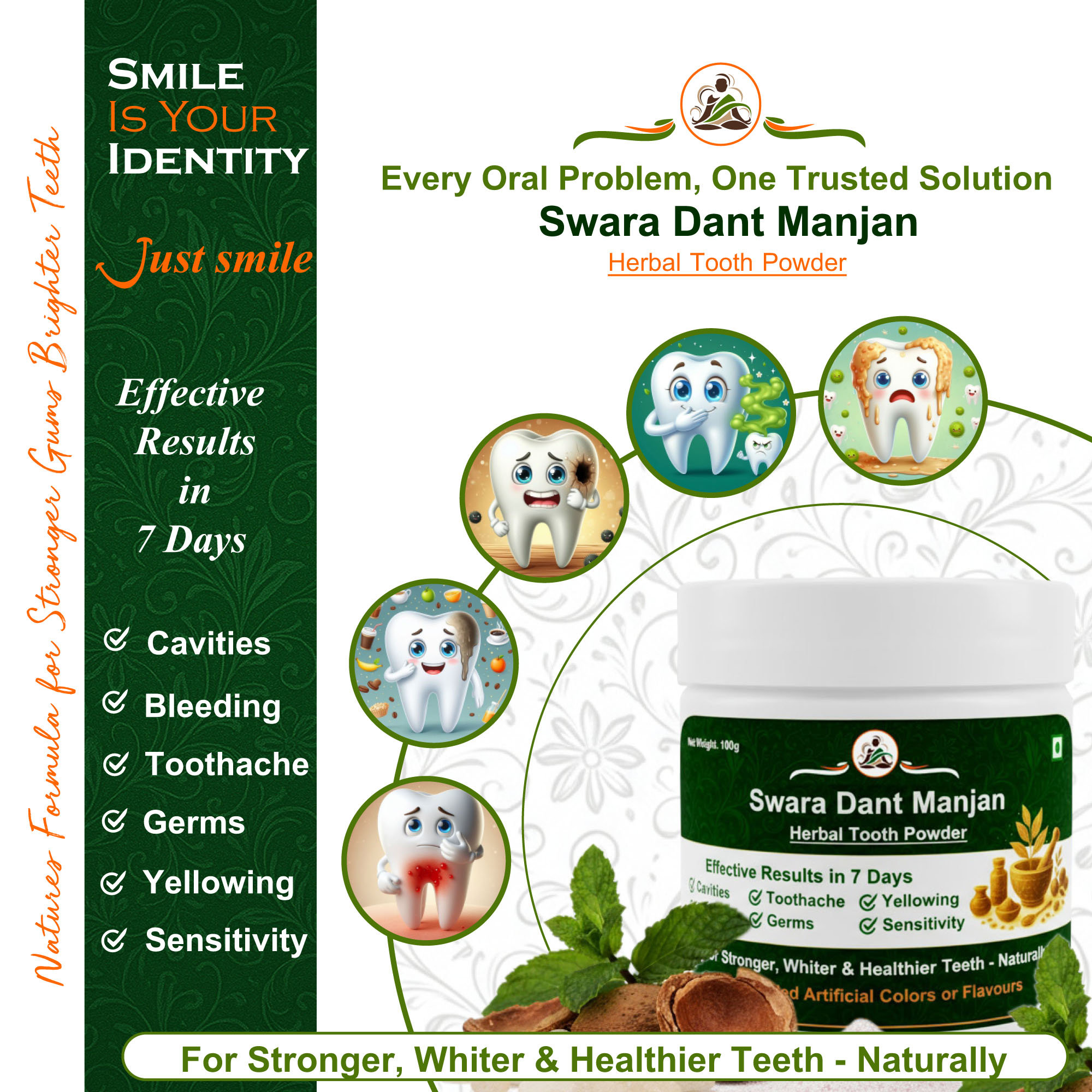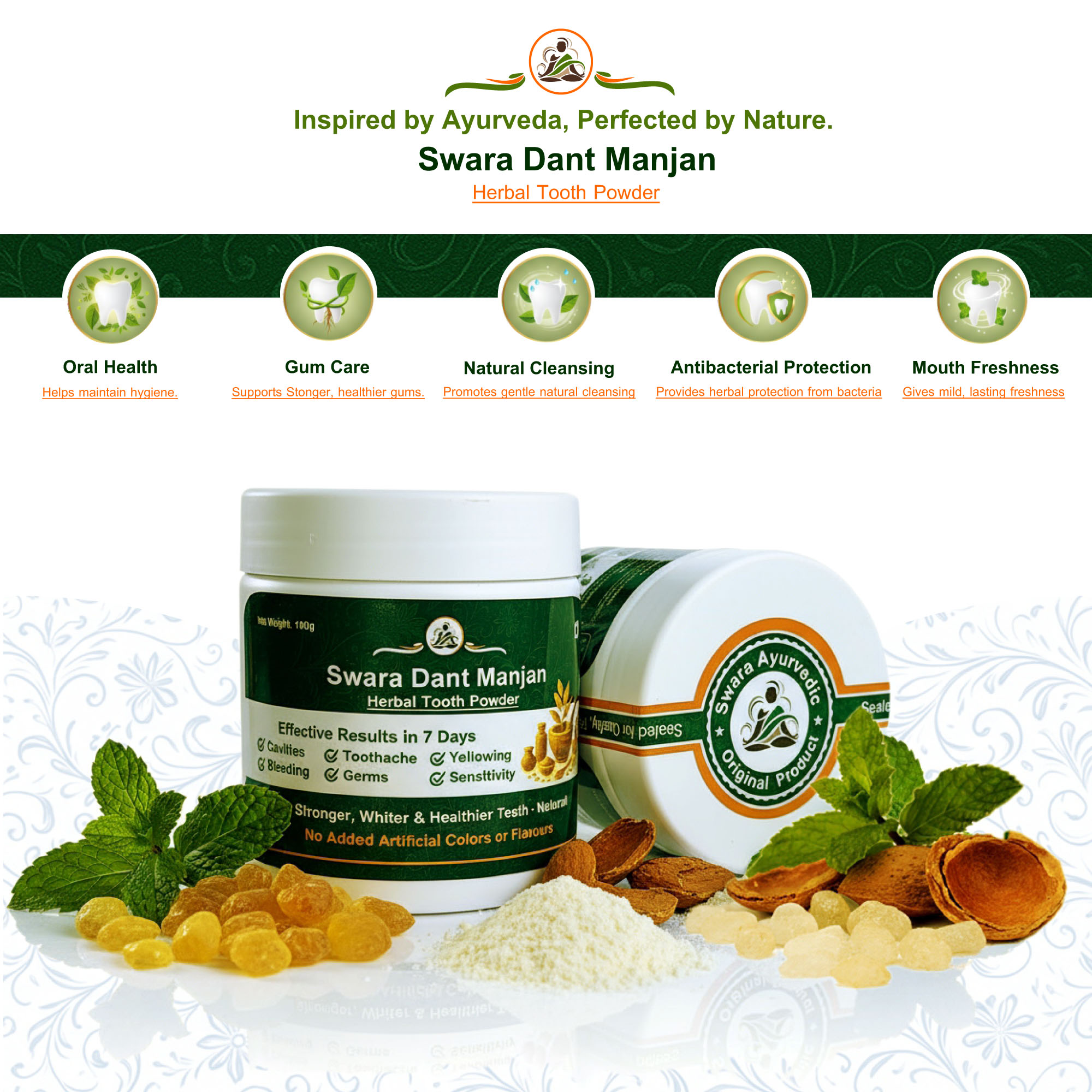 Experience the power of Ayurveda with Swara Dant Manjan, a carefully crafted herbal tooth powder designed to promote stronger teeth and healthier gums. Made with time-tested Ayurvedic ingredients, it helps combat common dental issues such as plaque, bad breath, and tooth sensitivity.